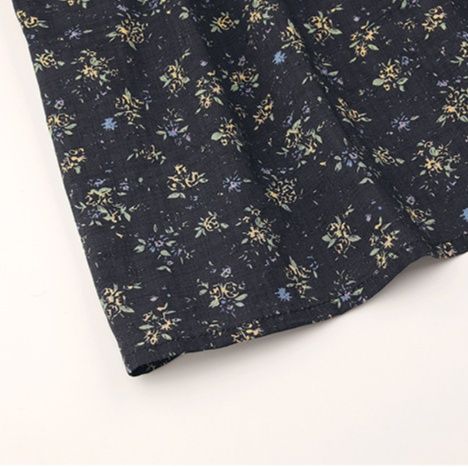 黒地に散りばめられた小さな花柄が上品な雰囲気を醸し出し、Vネックのデザインが首元をすっきりと見せてくれます。