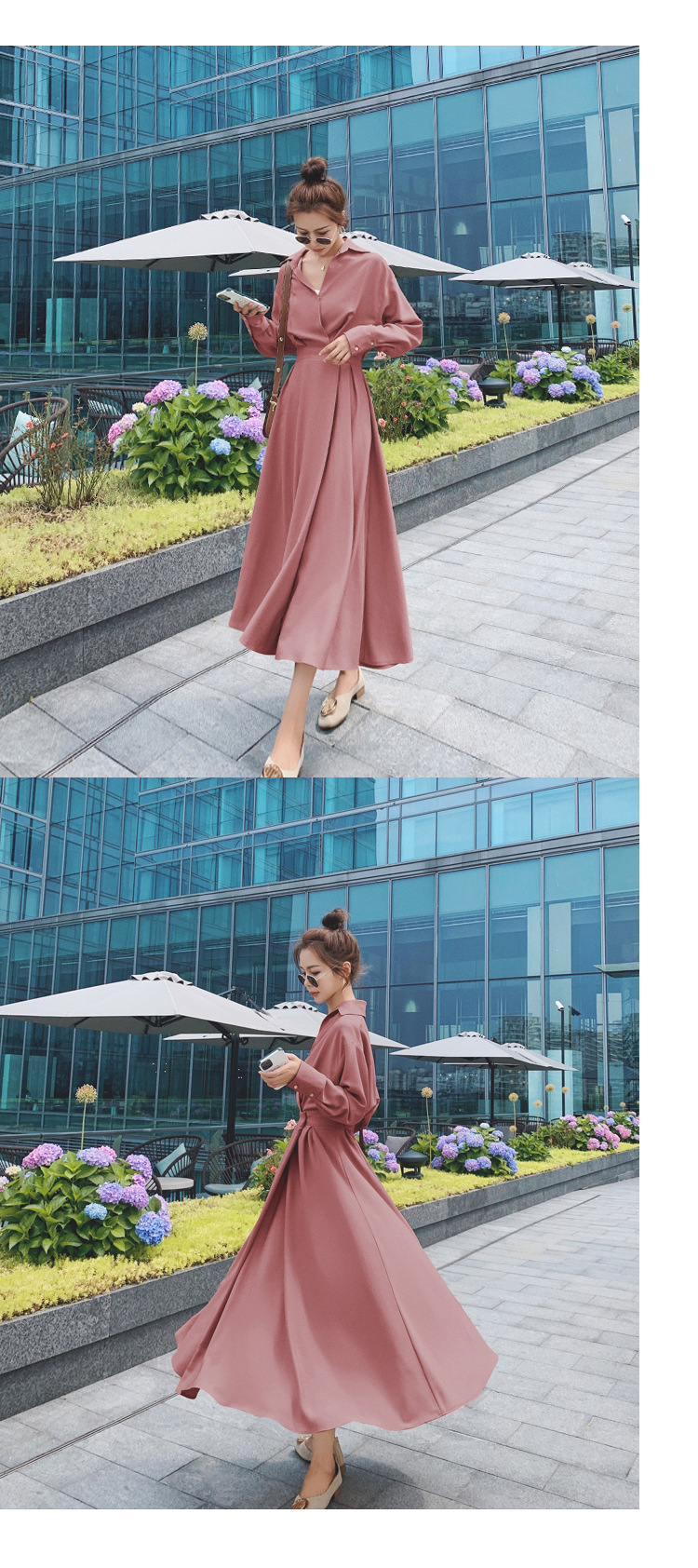 緩やかに広がるフレアスカートが、動きに合わせて優雅な揺れ感を演出